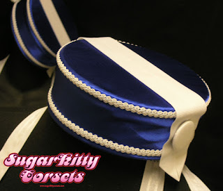 These Cigar Girl Costumes are part of a large ongoing order I'm working on for a magician's act, currently performing in Tennessee. The first outfits I've completed are these three identical Cigar Girl dresses with matching hats. The dresses are made from royal blue satin. The underskirt is white taffeta, with handmade taffeta and crinoline ruffles. The ruffles at the bustline are hand-gathered from organza ribbon, and the white trim at the bottom is matching organza.