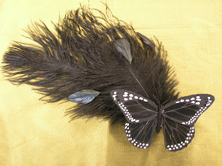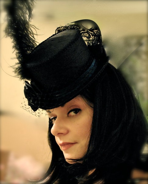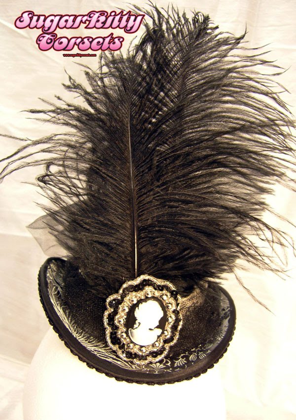The bustle is silver silk dupioni, with a velcro waist closure (so the wearer can easily put it on/take it off). The bloomers are silver satin. The waist and legs are elasticized, but the ribbons are also functional so that they're actually multi-size. The arm pieces are black stretchy mesh. The burgundy arm "garters" are also elasticized so they can be worn at the bicep, elbow, or wrist. The top hat is covered in burgundy silk dupioni.