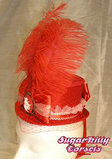The neck piece and wrist cuffs are made from a combination of red silk dupioni, tulle, and organza. The wrist cuffs are elasticized. The top hat is covered with red silk dupioni.