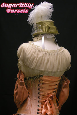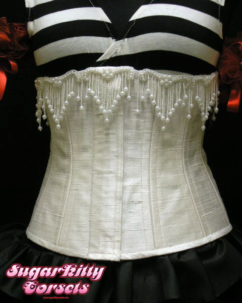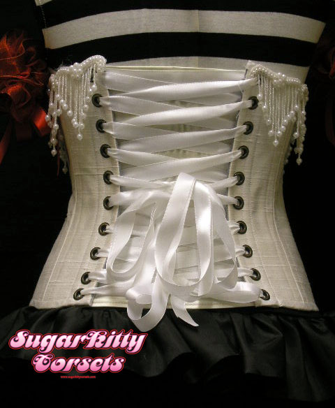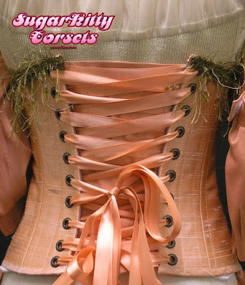 First (and what I consider most important) is the cost of materials. Every basic corset has fashion fabric (costing anywhere from a few dollars a yard to $30, $40, $50 a yard), then there's fusible web, interfacing, lining material, busk, boning, grommets, laces, and trim. Some corsets have other options, such as modesty panels, fancy trim, embellishments, garters, heavy duty busk, 1/2" boning upgrade, etc etc etc.