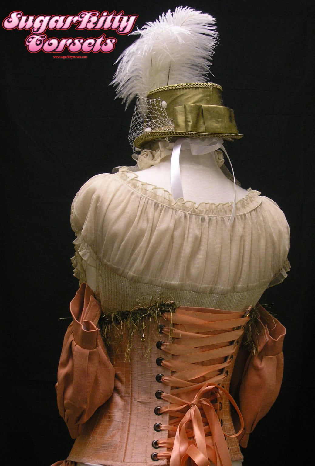The roses on the neckpiece are up-cycled from a satin halter top. I added the beading, antique gold tulle, and ribbon ties to the back. It's hard to tell, but the gold of the tulle almost matches the top perfectly. The top hat is covered with antique gold silk, and has ivory netting/feathers. It's hard to tell in the photos, but the silk of the corset is a golden peachy color, and shimmers in the light. It's actually quite a different shade from the skirt/arm pieces, even though they look kind of similar.