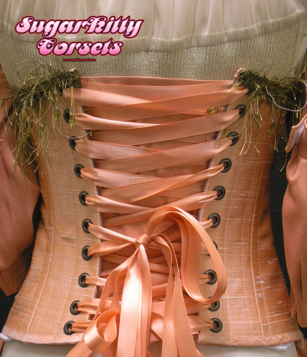 The corset is a "costume quality" corset. While it's still constructed of 4 layers of fabric, and still shown the same amount of meticulous detail shown to a standard corset, it is made a little differently. For starters, there is only steel boning at the front and back. There's plastic boning in the sides, so that the wearer can move and bend in it. It has a (hidden) zipper front closure, and a sewn-in stretchy modesty panel at the back. It has only a very slight waist reduction. It functions as a corset, but is mostly for show. It will stand up to repeated wearings, but would not be suitable for any substantial waist-reduction or waist-training.