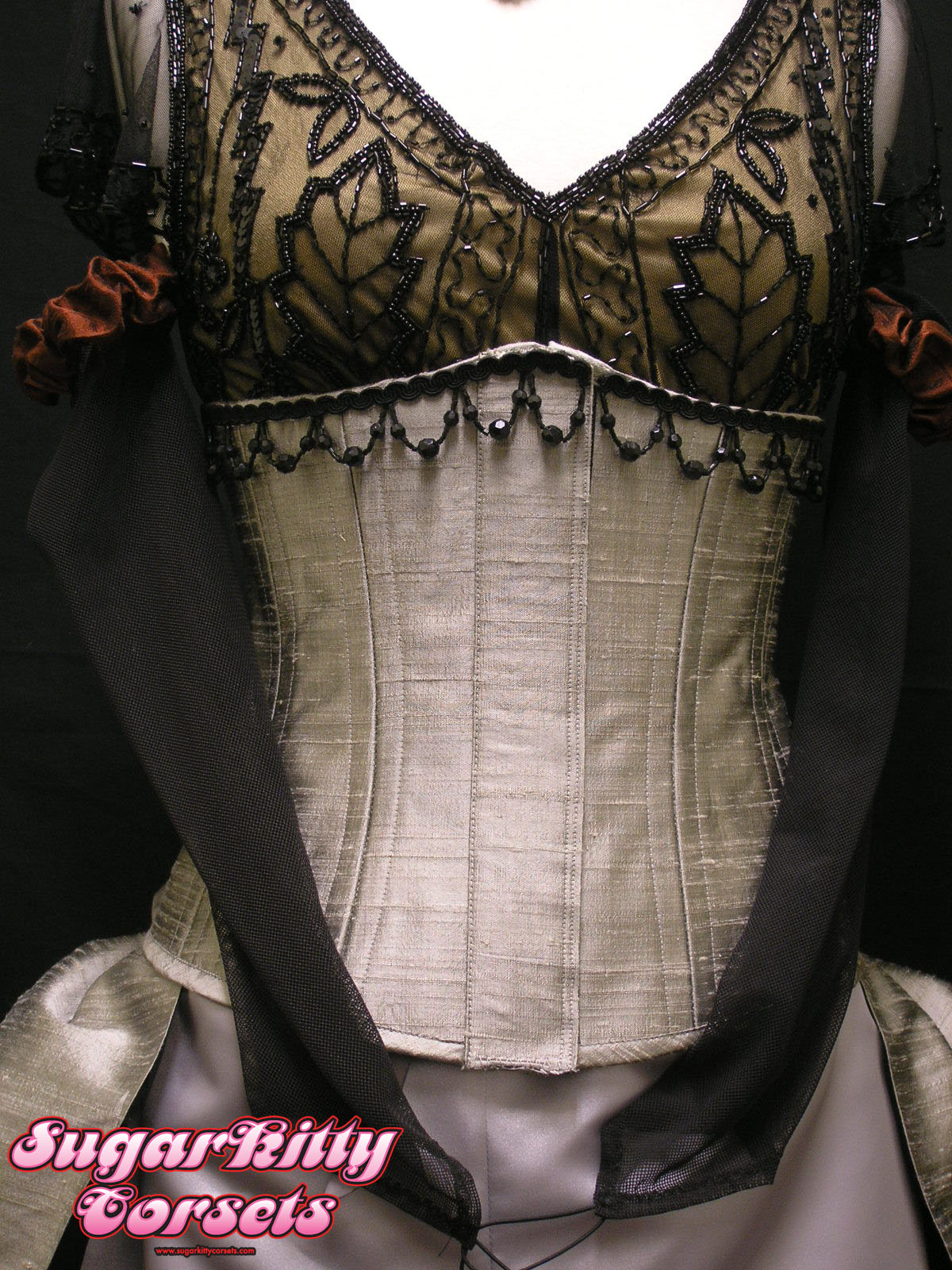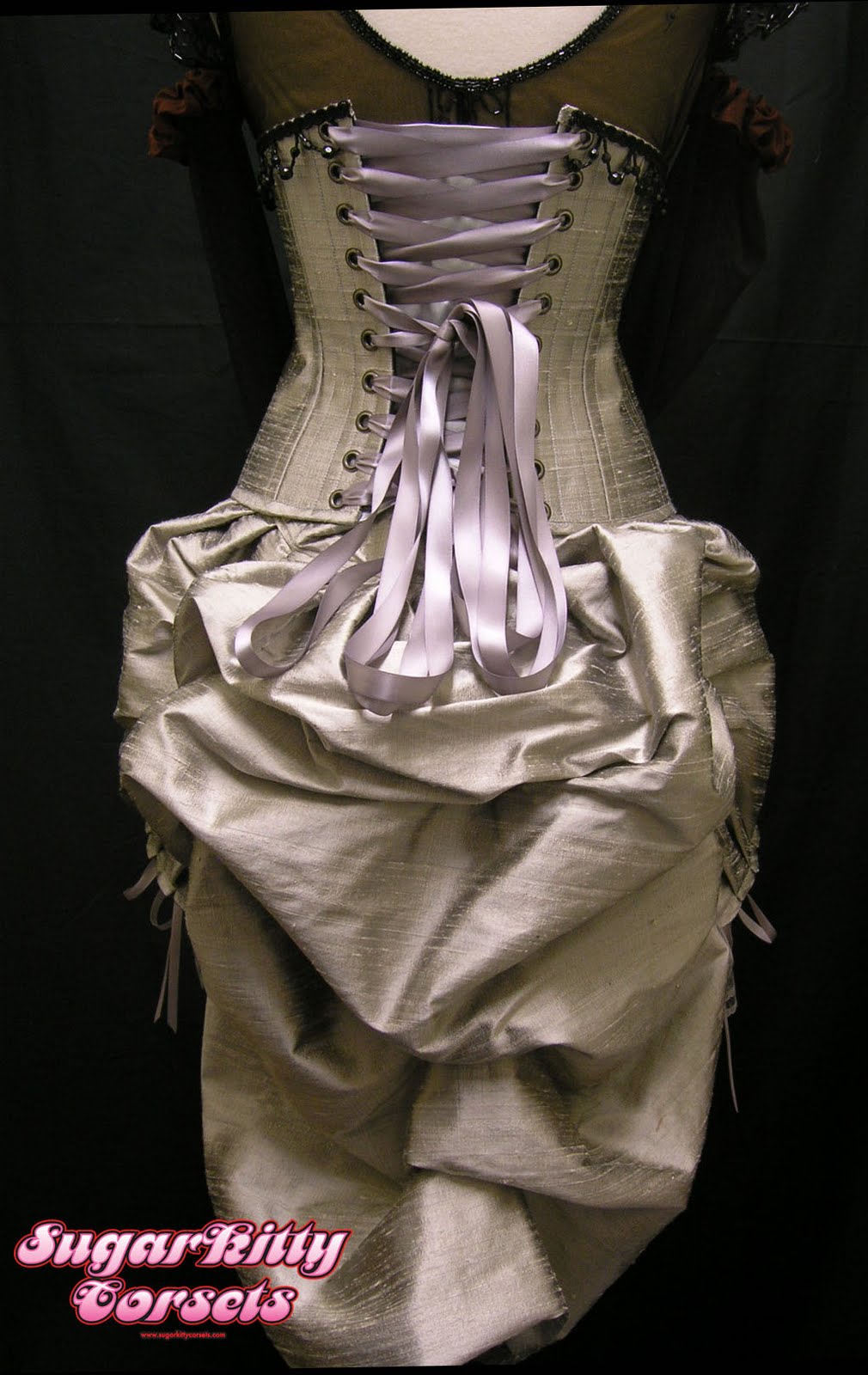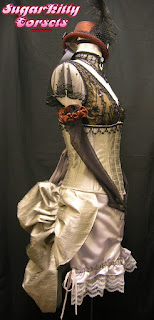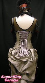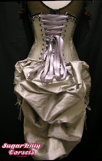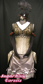 The corset is a "costume quality" corset. While it's still constructed of 4 layers of fabric, and still shown the same amount of meticulous detail shown to a standard corset, it is made a little differently. For starters, there is only steel boning at the front and back. There's plastic boning in the sides, so that the wearer can move and bend in it. It has a (hidden) zipper front closure, and a sewn-in stretchy modesty panel at the back. It has only a very slight waist reduction. It functions as a corset, but is mostly for show. It will stand up to repeated wearings, but would not be suitable for any substantial waist-reduction or waist-training.