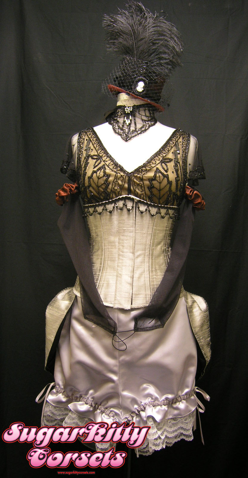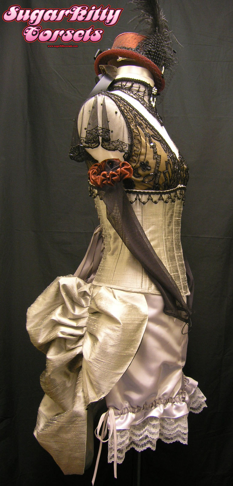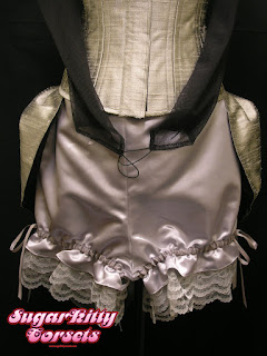 The bustle is silver silk dupioni, with a velcro waist closure (so the wearer can easily put it on/take it off). The bloomers are silver satin. The waist and legs are elasticized, but the ribbons are also functional so that they're actually multi-size. The arm pieces are black stretchy mesh. The burgundy arm "garters" are also elasticized so they can be worn at the bicep, elbow, or wrist. The top hat is covered in burgundy silk dupioni.