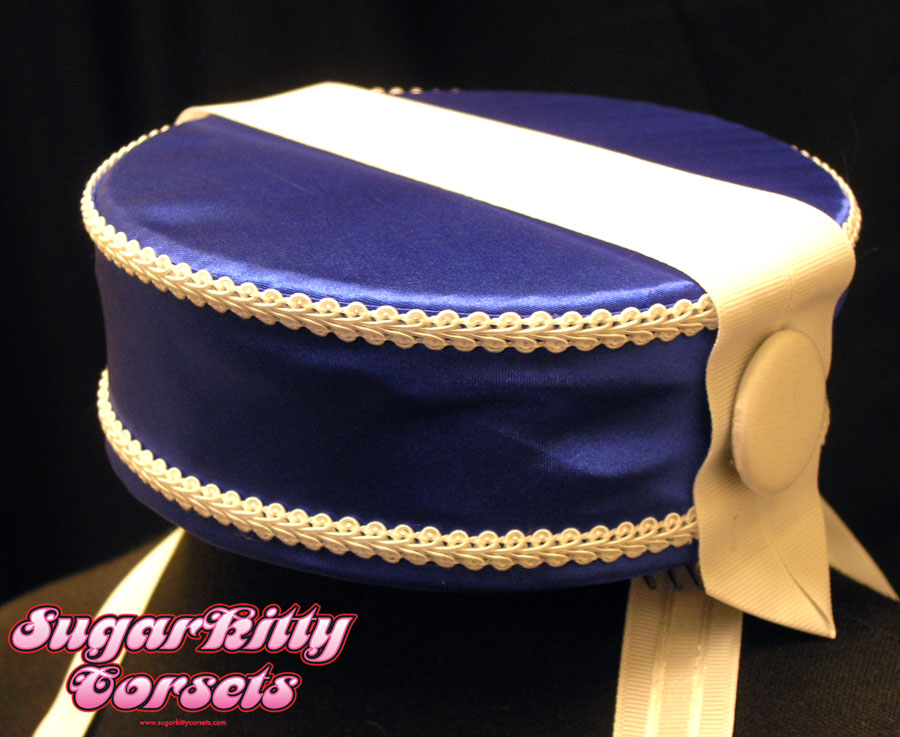 These Cigar Girl Costumes are part of a large ongoing order I'm working on for a magician's act, currently performing in Tennessee. The first outfits I've completed are these three identical Cigar Girl dresses with matching hats. The dresses are made from royal blue satin. The underskirt is white taffeta, with handmade taffeta and crinoline ruffles. The ruffles at the bustline are hand-gathered from organza ribbon, and the white trim at the bottom is matching organza.